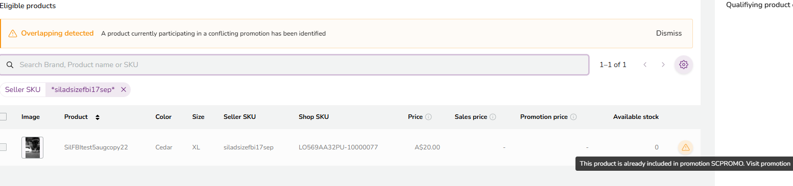 Hovering over the warning icon will show which promotion the SKU is included in, and clicking the icon will take you directly to that promotion.