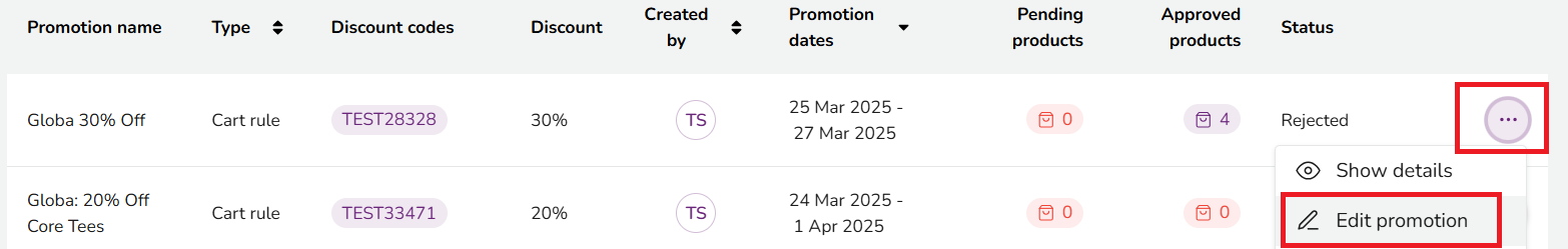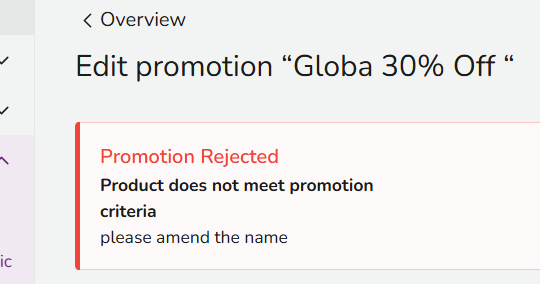 If the promotion has been rejected, for example due to an obvious typographical error as shown in the example below, the rejection reason will be displayed. You can edit the promotion, and re-submit it for review.