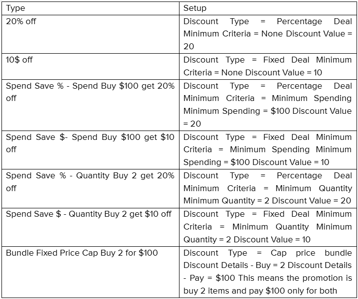 See the table below for instructions on setting up different promotion types.