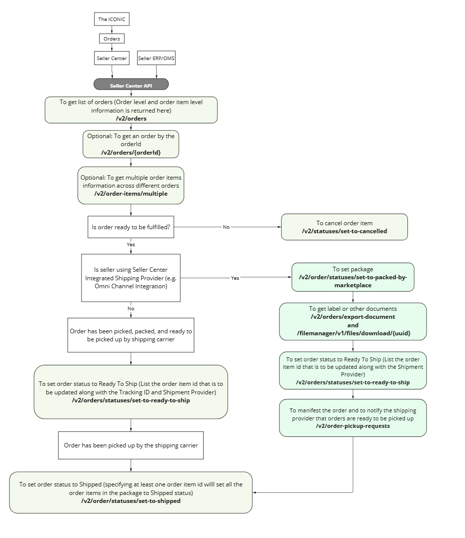 For sellers who are shipping orders using THE ICONIC integrated carrier (Shipped By The Iconic model), there are additional calls to generate, retrieve, and manifest the shipping label
