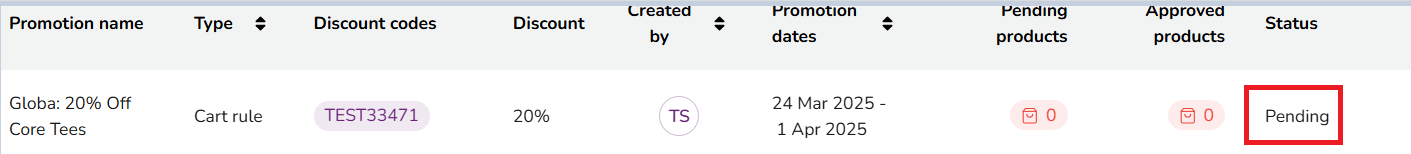 | Pending | Seller Promotion is yet to be reviewed by Admin |