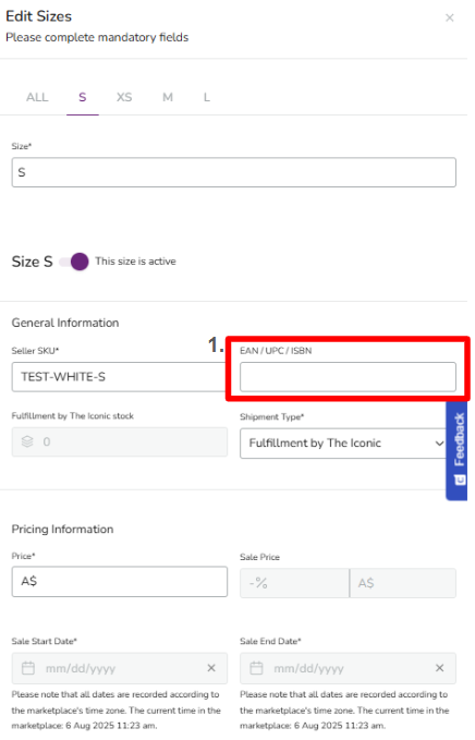 9. Locate the EAN field and enter the correct EAN in the blank section provided