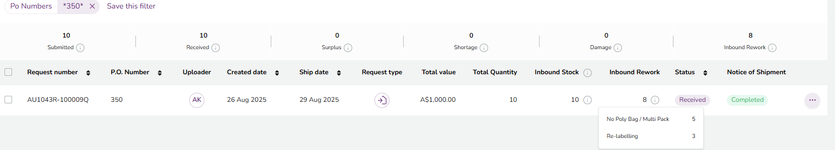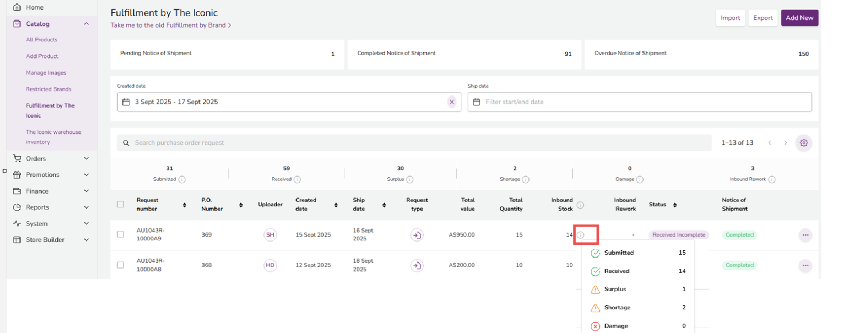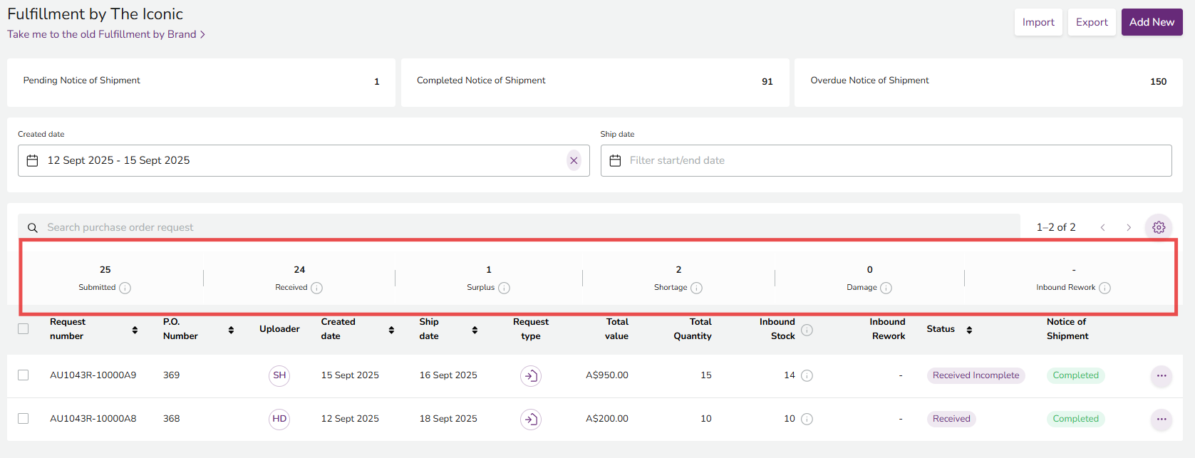 In the Seller Center Fulfillment by THE ICONIC page, you can also see total of Inbound / Rework stock breakdown at the header level across multiple Inbound Stock Request for a range of date period.