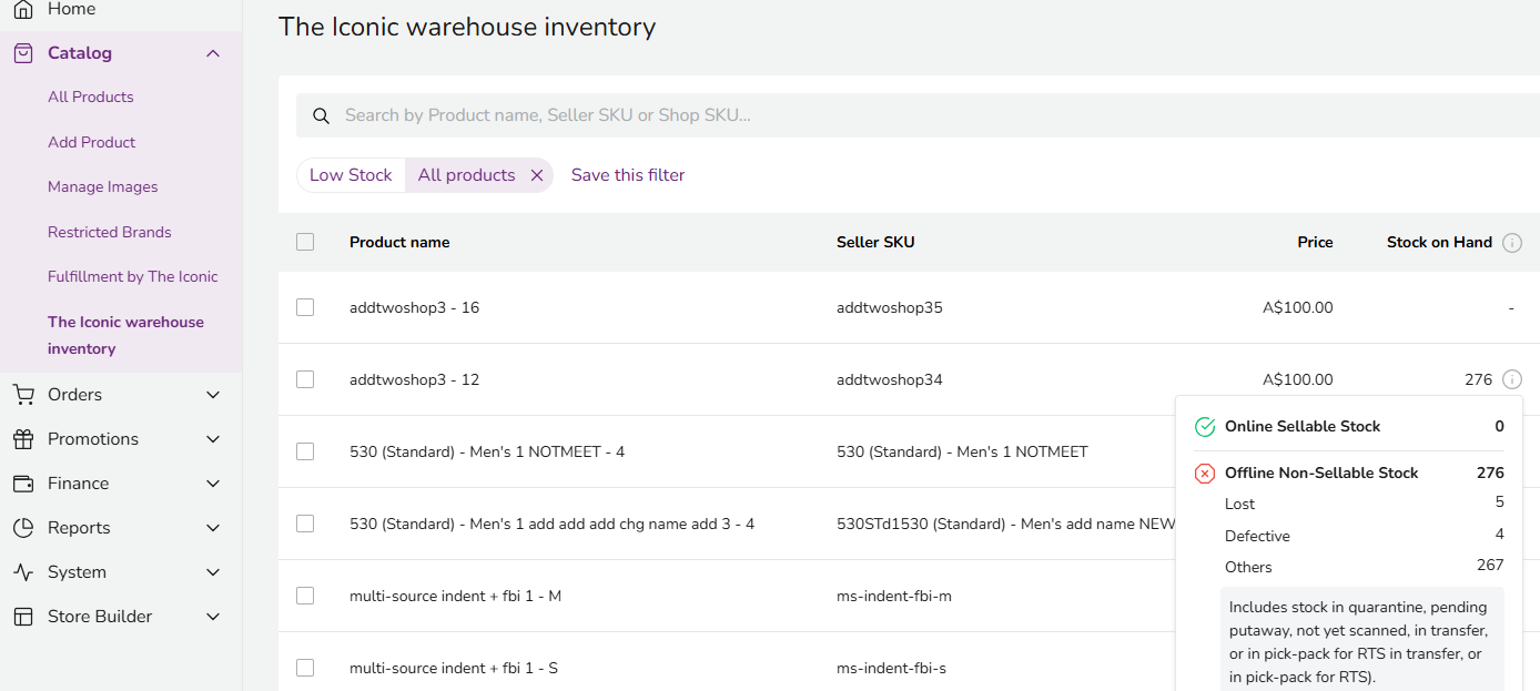 In the Seller Center - Catalog - THE ICONIC Warehouse Inventory page, there is a column called "Stock On Hand". Hover on the symbol to view the specific SKU stock breakdown.