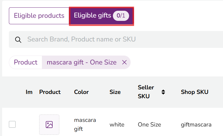 Add your gift SKU (the SKU that has been marked as Is Gift during creation process). Please ensure only gift SKU is added here, do not add normal selling SKU. Only one gift is allowed to be added.