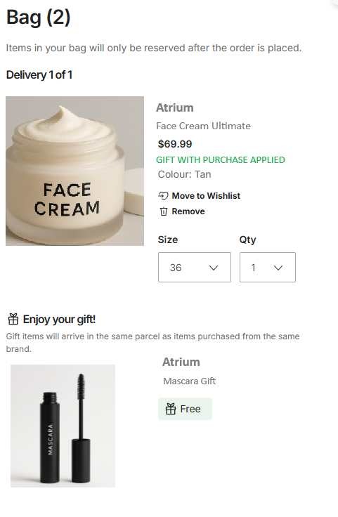 Your Gift With Purchase promotion will then show as Pending status, subject to acknowledgment from THE ICONIC team.Once it has been acknowledged, the status will update, and this is what our customers will see in our website.