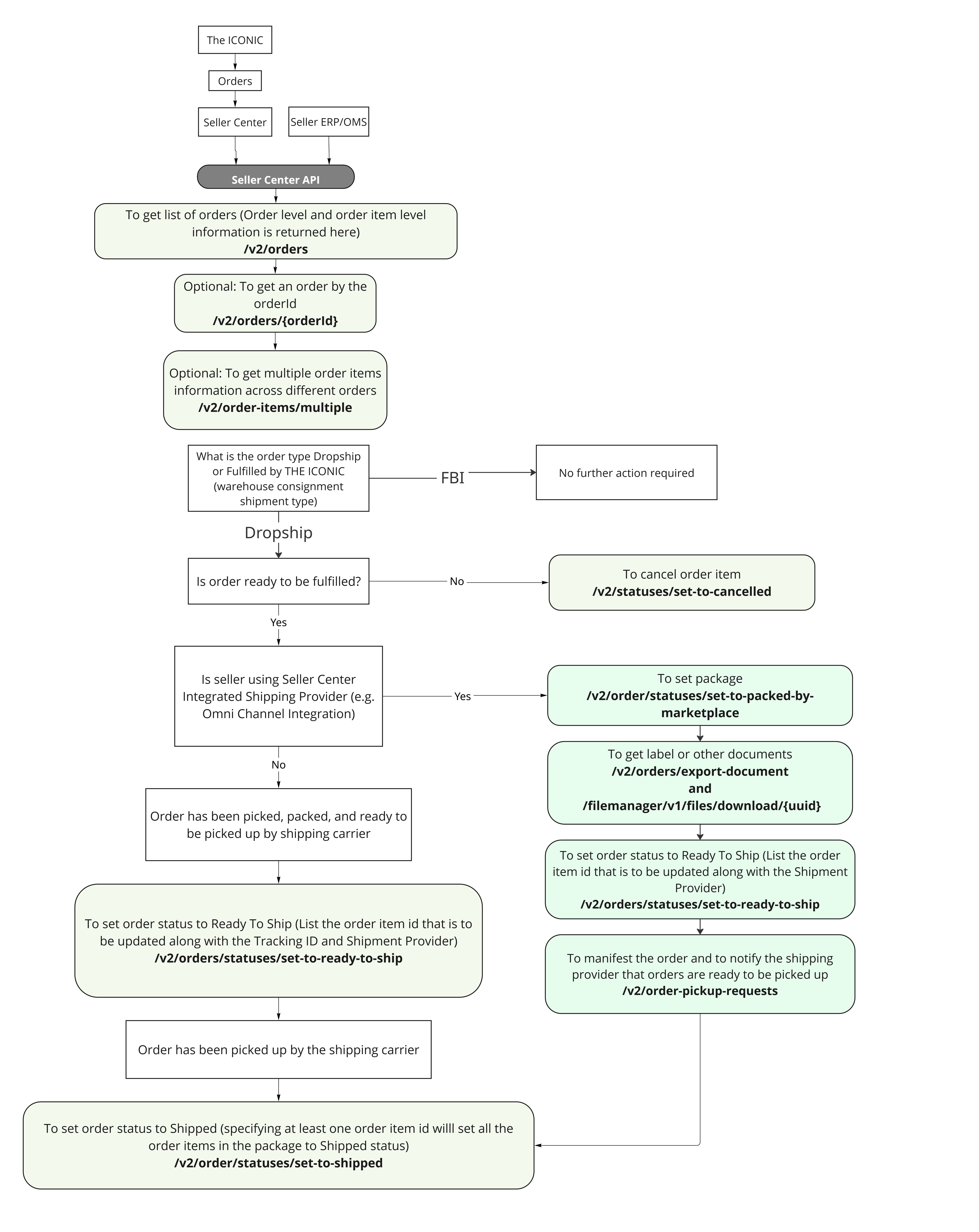 For sellers who are shipping orders using THE ICONIC integrated carrier (Shipped By The Iconic model), there are additional calls to generate, retrieve, and manifest the shipping label